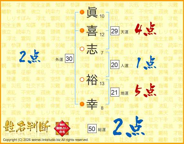 眞(10画)喜(12画)志(7画) 裕(13画)幸(8画)
