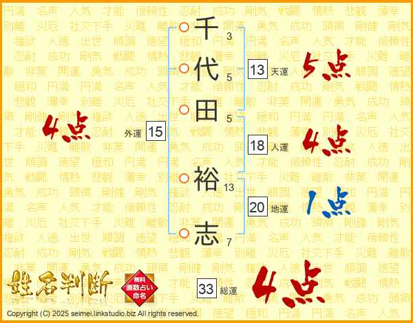 千(3画)代(5画)田(5画) 裕(13画)志(7画)