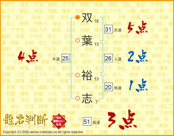あなたの人生を表す1番重要な運勢です。生涯を通じて影響する総合運となり、主に50歳以降の晩年期に影響を及ぼします。苗字と名前の合計画数。
