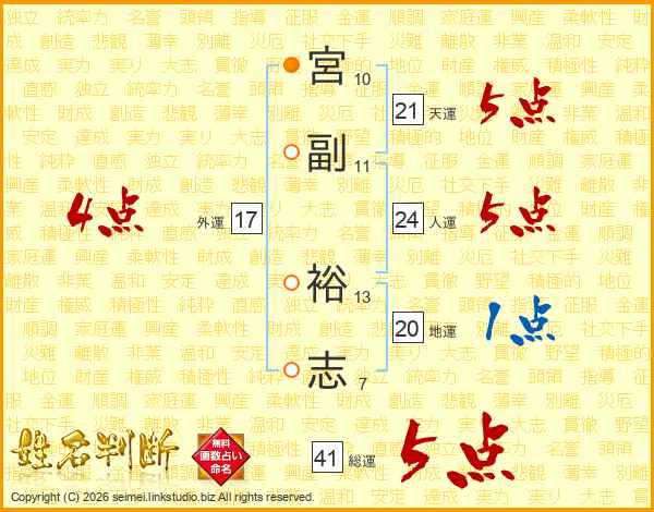 生活面を象徴する運勢です。外部から受ける影響力を表し、結婚運、家庭運や職場、環境への順応性を表します。総運から人運を引いた画数。姓や名が1文字の場合を除く。