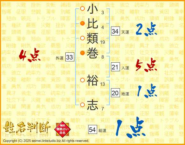 小(3画)比(4画)類(19画)巻(8画) 裕(13画)志(7画)