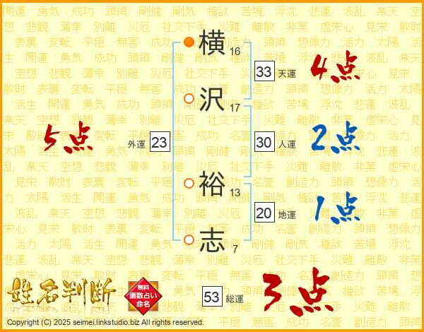 生活面を象徴する運勢です。外部から受ける影響力を表し、結婚運、家庭運や職場、環境への順応性を表します。総運から人運を引いた画数。姓や名が1文字の場合を除く。