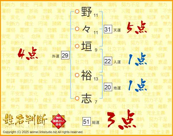 野(11画)々(11画)垣(9画) 裕(13画)志(7画)