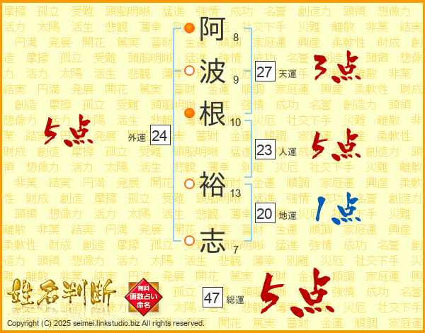 阿(8画)波(9画)根(10画) 裕(13画)志(7画)