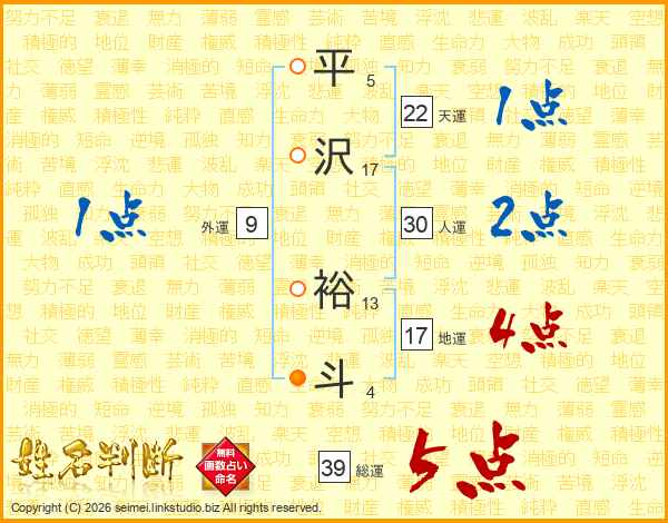 平(5画)沢(17画) 裕(13画)斗(4画)