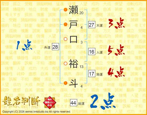 瀬(20画)戸(4画)口(3画) 裕(13画)斗(4画)