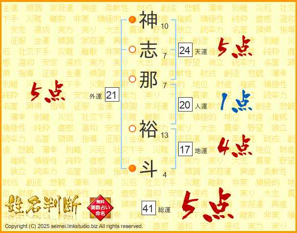 神(10画)志(7画)那(7画) 裕(13画)斗(4画)