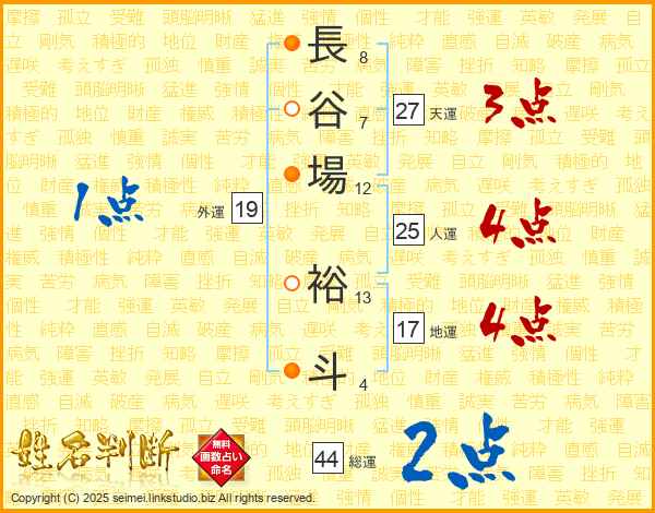 長(8画)谷(7画)場(12画) 裕(13画)斗(4画)