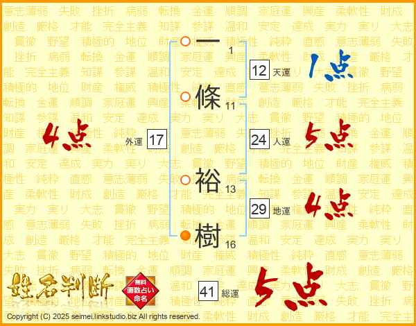 あなたの人生を表す1番重要な運勢です。生涯を通じて影響する総合運となり、主に50歳以降の晩年期に影響を及ぼします。苗字と名前の合計画数。