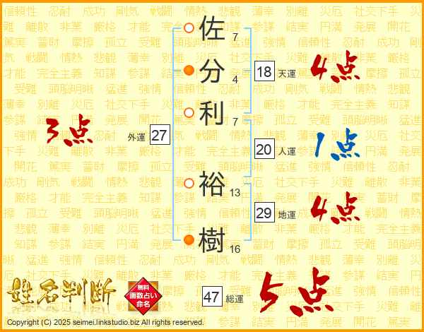 佐(7画)分(4画)利(7画) 裕(13画)樹(16画)