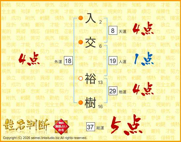 生活面を象徴する運勢です。外部から受ける影響力を表し、結婚運、家庭運や職場、環境への順応性を表します。総運から人運を引いた画数。姓や名が1文字の場合を除く。