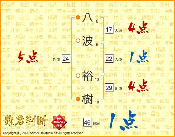 八波裕樹さんの総運は46画の1点!