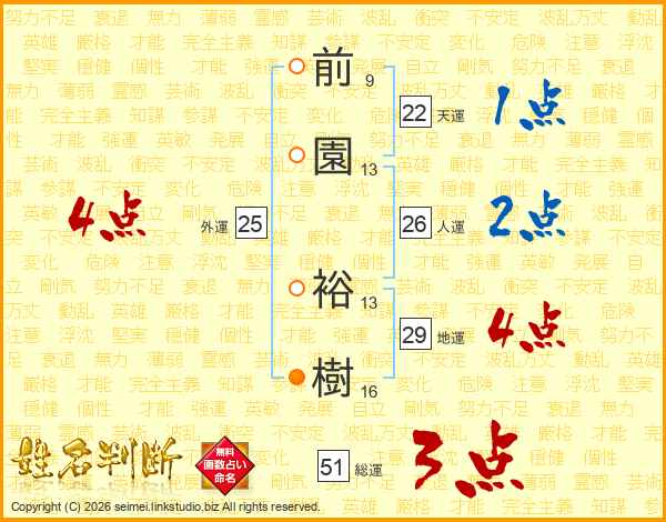 前(9画)園(13画) 裕(13画)樹(16画)