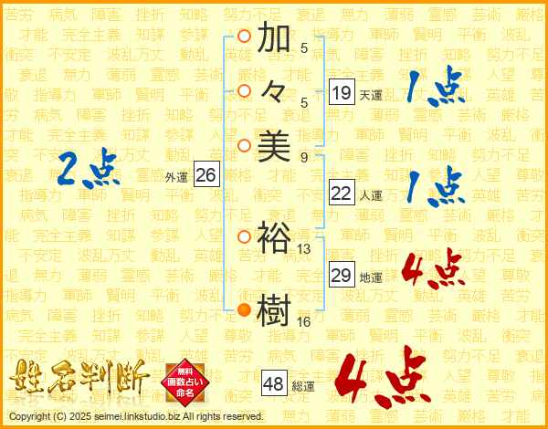 加(5画)々(5画)美(9画) 裕(13画)樹(16画)