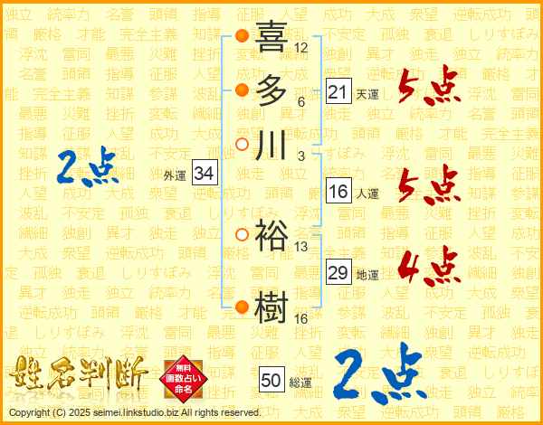喜(12画)多(6画)川(3画) 裕(13画)樹(16画)