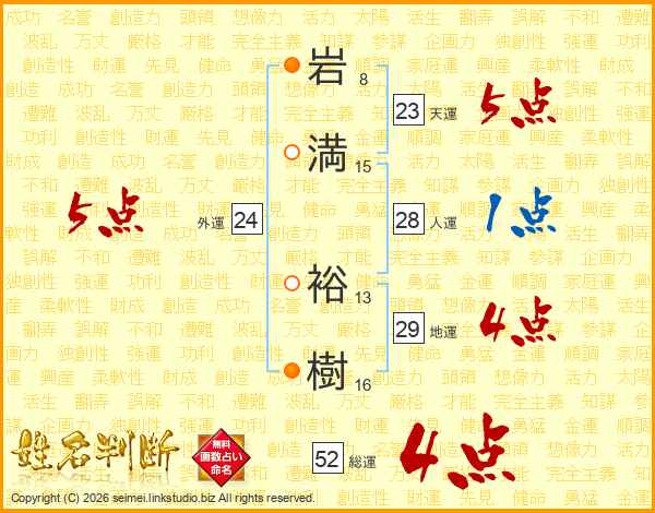 岩(8画)満(15画) 裕(13画)樹(16画)