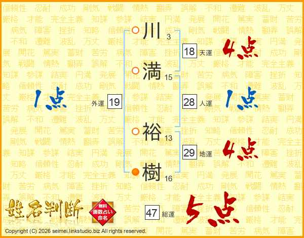 あなたの人生を表す1番重要な運勢です。生涯を通じて影響する総合運となり、主に50歳以降の晩年期に影響を及ぼします。苗字と名前の合計画数。