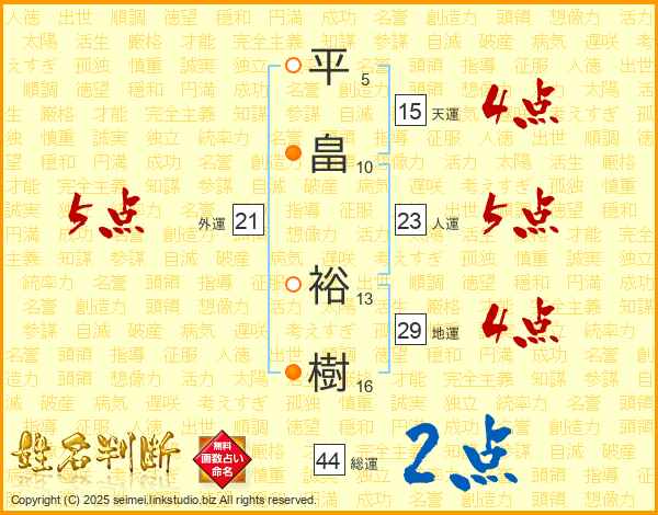 平(5画)畠(10画) 裕(13画)樹(16画)
