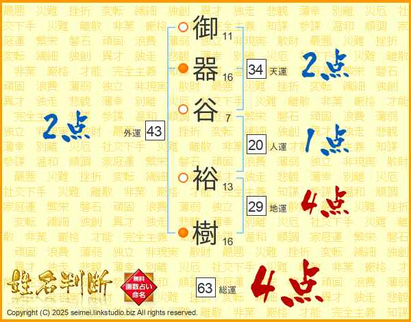 御(11画)器(16画)谷(7画) 裕(13画)樹(16画)