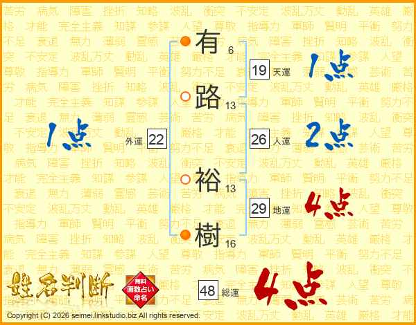 あなたの人生を表す1番重要な運勢です。生涯を通じて影響する総合運となり、主に50歳以降の晩年期に影響を及ぼします。苗字と名前の合計画数。