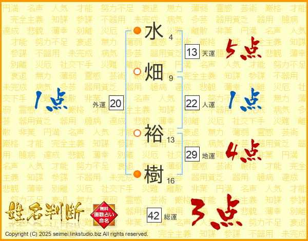 水(4画)畑(9画) 裕(13画)樹(16画)