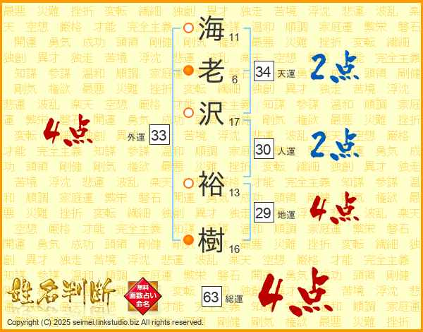 海(11画)老(6画)沢(17画) 裕(13画)樹(16画)