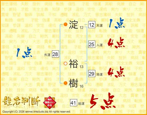 あなたの人生を表す1番重要な運勢です。生涯を通じて影響する総合運となり、主に50歳以降の晩年期に影響を及ぼします。苗字と名前の合計画数。