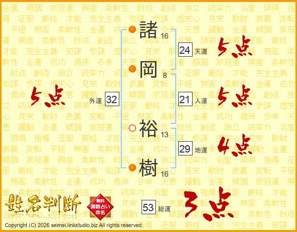 諸(16画)岡(8画) 裕(13画)樹(16画)