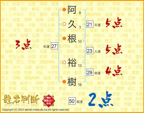 阿(8画)久(3画)根(10画) 裕(13画)樹(16画)
