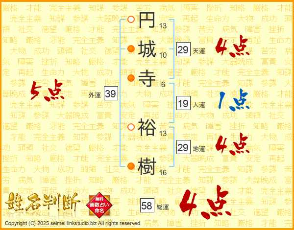 円(13画)城(10画)寺(6画) 裕(13画)樹(16画)