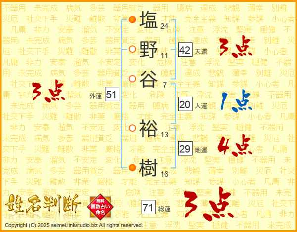 塩野谷裕樹さんの地運は29画の4点!