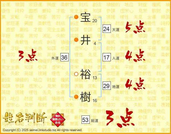 宝(20画)井(4画) 裕(13画)樹(16画)