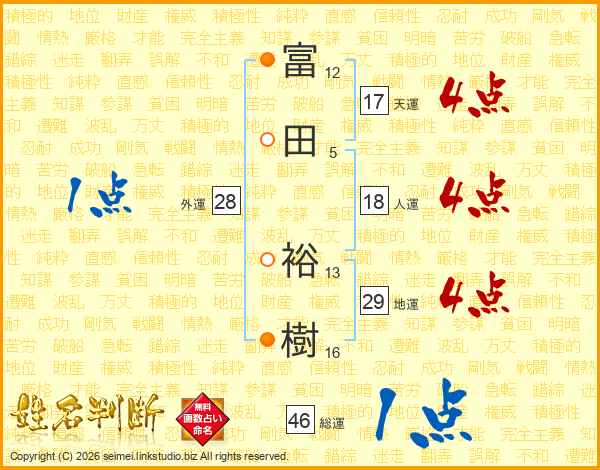 あなたの人生を表す1番重要な運勢です。生涯を通じて影響する総合運となり、主に50歳以降の晩年期に影響を及ぼします。苗字と名前の合計画数。
