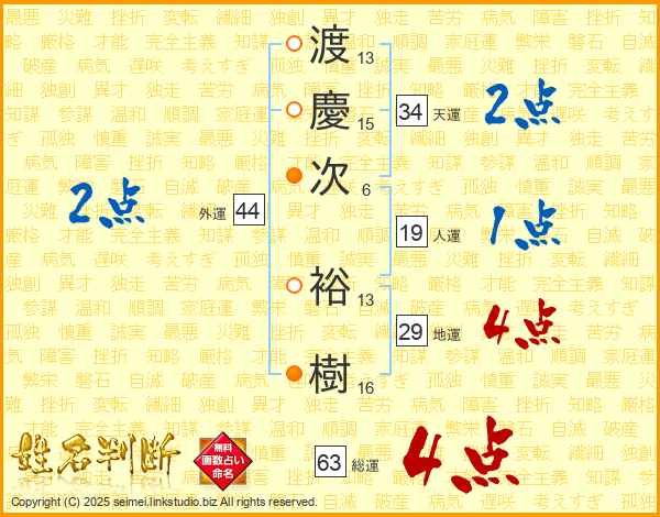 渡(13画)慶(15画)次(6画) 裕(13画)樹(16画)