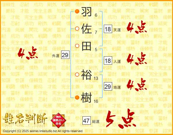 羽(6画)佐(7画)田(5画) 裕(13画)樹(16画)