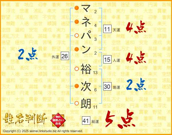 マ(2画)ネ(4画)パ(3画)ン(2画) 裕(13画)次(6画)朗(11画)