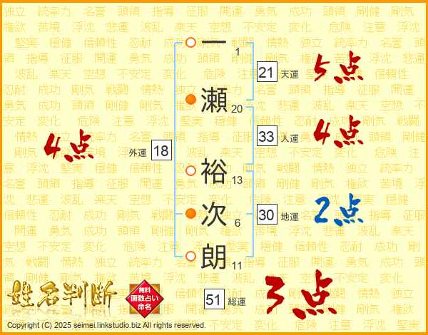 一(1画)瀬(20画) 裕(13画)次(6画)朗(11画)