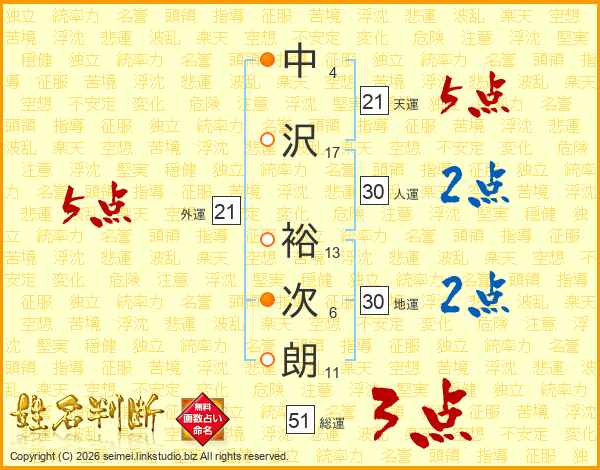 中沢裕次朗さんの天運は21画の5点!