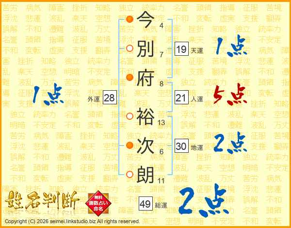 今(4画)別(7画)府(8画) 裕(13画)次(6画)朗(11画)