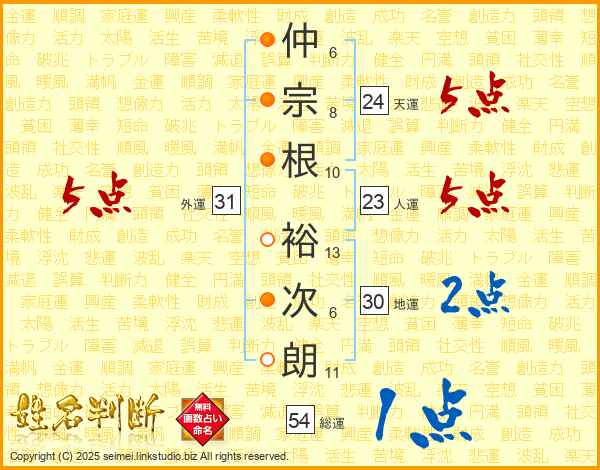 仲宗根裕次朗さんの人運は23画の5点!