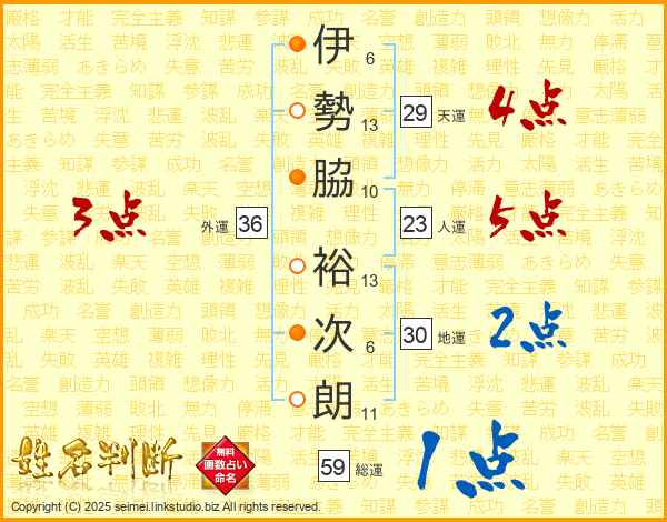 伊(6画)勢(13画)脇(10画) 裕(13画)次(6画)朗(11画)