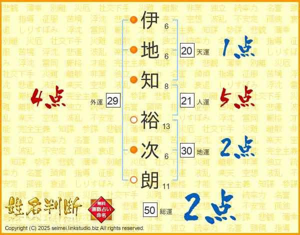 伊(6画)地(6画)知(8画) 裕(13画)次(6画)朗(11画)