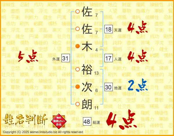 佐(7画)佐(7画)木(4画) 裕(13画)次(6画)朗(11画)