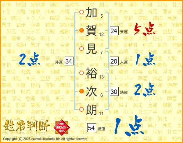 加(5画)賀(12画)見(7画) 裕(13画)次(6画)朗(11画)