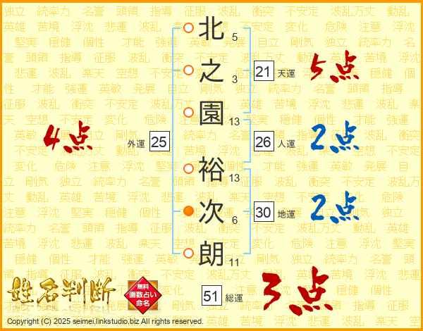 北(5画)之(3画)園(13画) 裕(13画)次(6画)朗(11画)