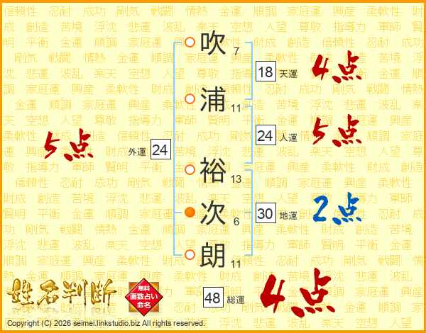 吹(7画)浦(11画) 裕(13画)次(6画)朗(11画)