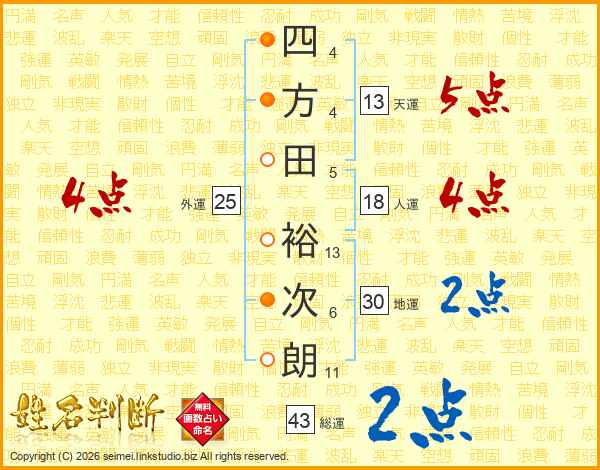 四(4画)方(4画)田(5画) 裕(13画)次(6画)朗(11画)