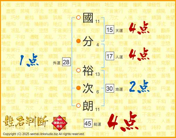 國(11画)分(4画) 裕(13画)次(6画)朗(11画)
