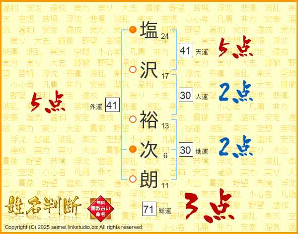 塩(24画)沢(17画) 裕(13画)次(6画)朗(11画)