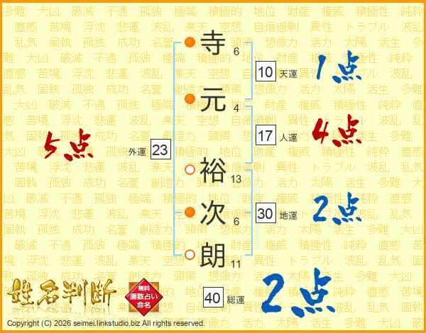 寺(6画)元(4画) 裕(13画)次(6画)朗(11画)